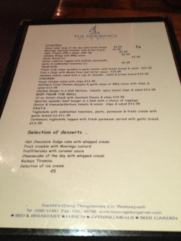 The Moorings is a friendly bar and restaurant steeped in maritime history, and situated right beside the 12th Century King John's Castle, on the picturesque quayside in Dungarvan, Co. Waterford. Here, locals and visitors alike enjoy top quality drinks, stunning bar and a la carte menus and genuinely friendly service in this family run business.